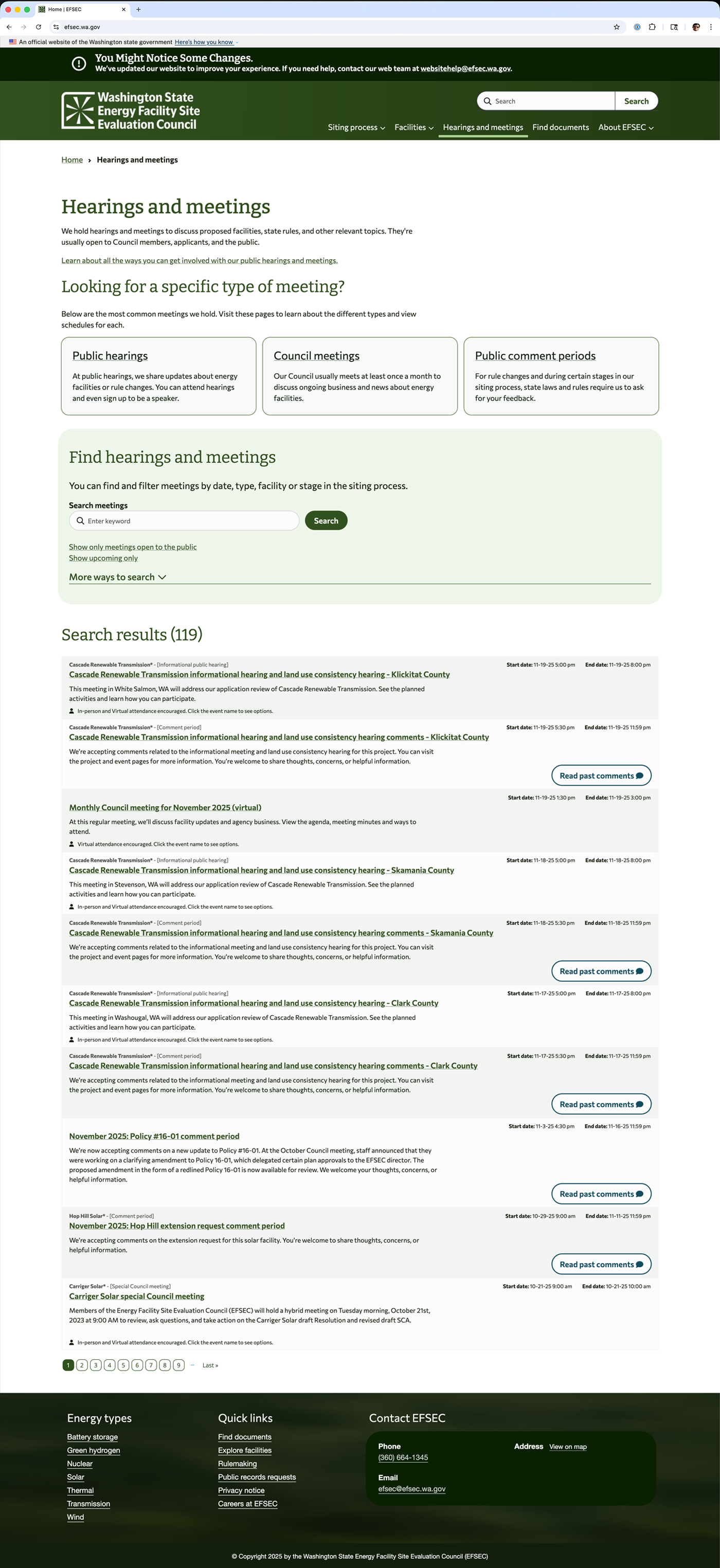 I redesigned and rebranded the public website for Washington Energy Facility Site Evaluation Council, which is a state level branch of a federal department that oversees privately run energy production facilities from siting and surveying pre-construction, through decommissioning at end of life. The process is complex, often spanning many years and at the scrutiny of the public who live in the communities near which prospective sites are being considered. While the public had long been complaining that it was too hard to find information on the old website, the internal staff also had trouble managing it.